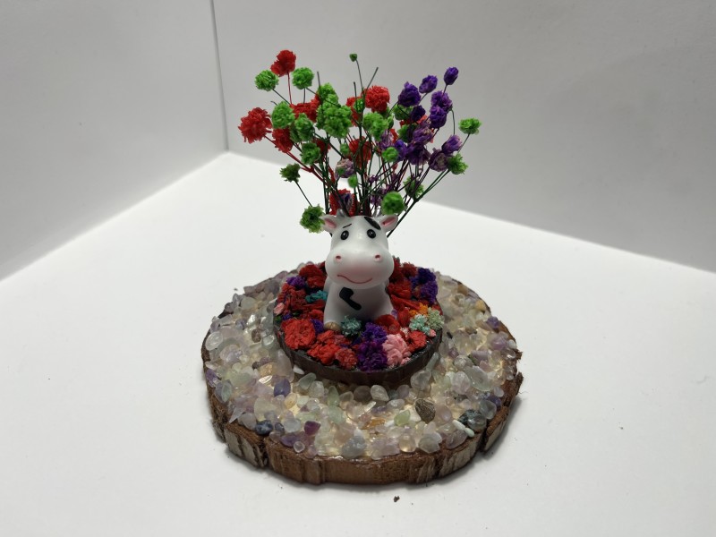 Sitting Cow Under A Tree of Red, Green & Purple Flowers. Vibrant Fluorite Stones.